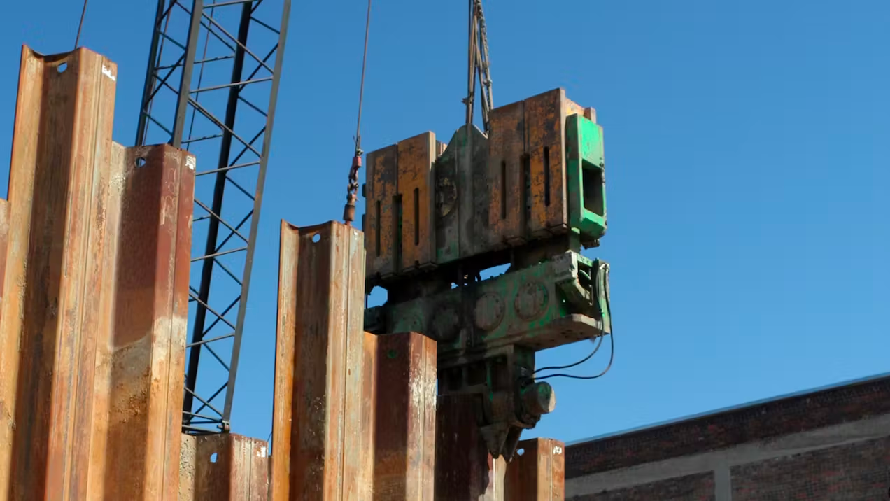 打桩机允许工作人员将重达数千磅的金属板振动到地面上,为建筑物打下坚固的地基。这将限制成品患者护理区域的噪音和振动。