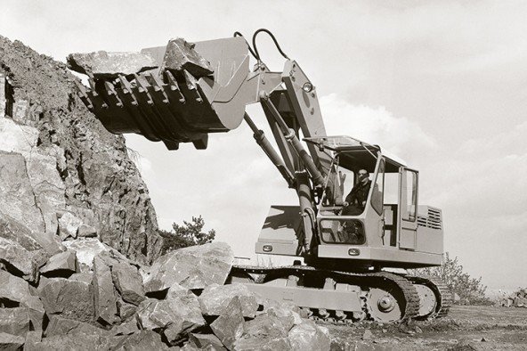 汉斯·利勃海尔在1953年租了一台电缆挖掘机,他注意到功率重量比很低。八个月后,他展示了欧洲第一台液压挖掘机—L300。这比租用机器轻了四倍。1954年,强力机开始批量生产。